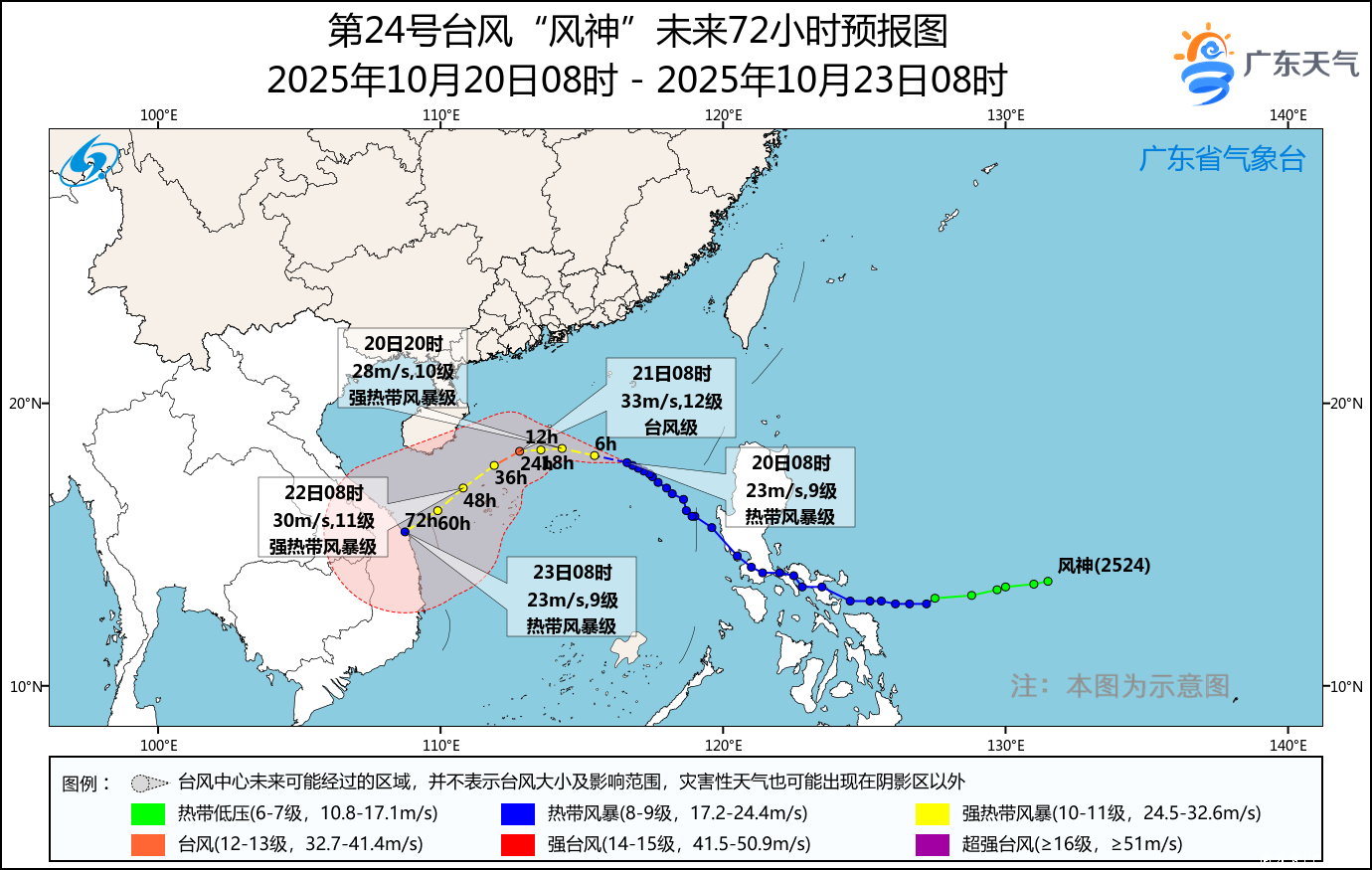 大风预报:20-22日,台湾海峡、南海北部、广东海面风力7~9级、阵风10~11级,台风中心经过的附近海域风力11~12级、阵风13级;琼州海峡风力6~7级、阵风8级;沿海市县阵风6~8级。